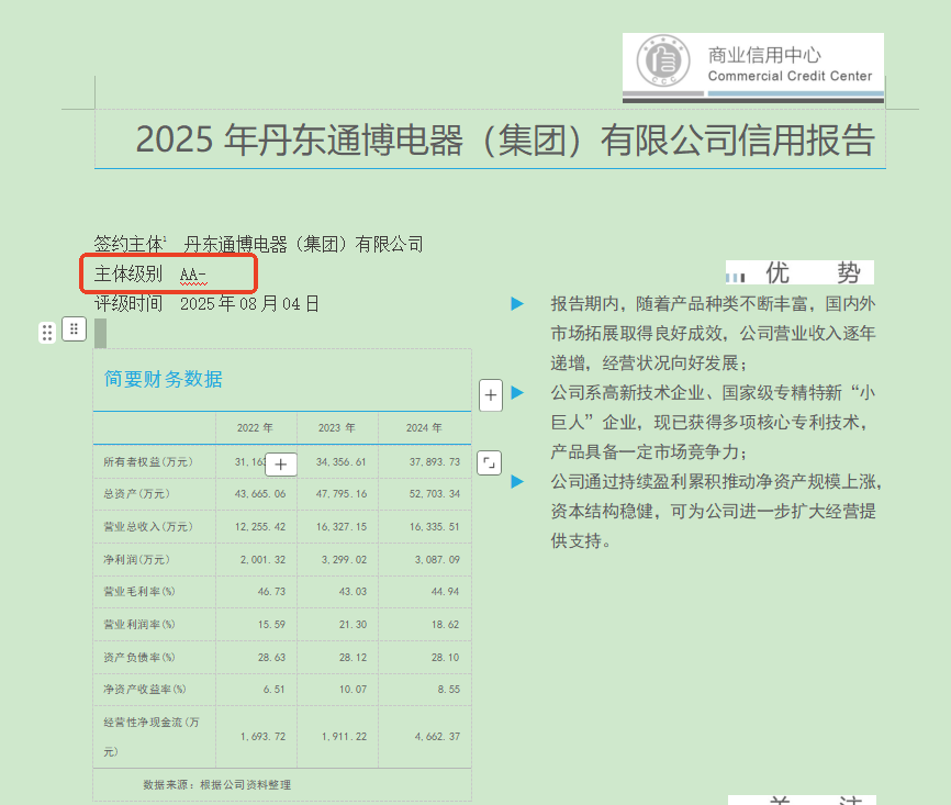 The credit rating of the legal representative is not given casually. It is based on professional standards and conducts a comprehensive “examination” of the enterprise’s performance ability and default risk. What does the upgrade from A+ to AA- mean? According to the legal representative credit certification standards, AA- indicates that the enterprise has strong performance ability and a very low default risk. In the face of economic environment fluctuations, its resilience is also more outstanding!